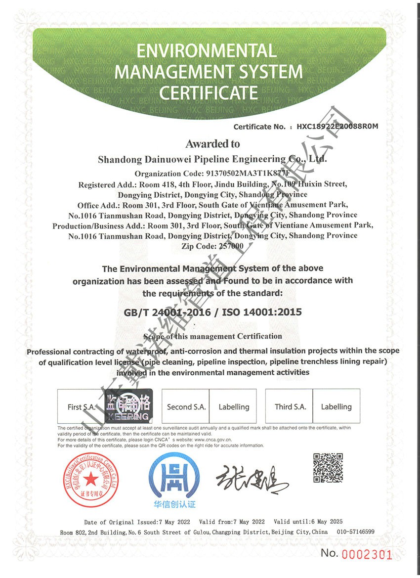 管道非開挖修復工程服務企業(yè)資質(zhì)證書