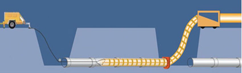 內(nèi)襯復合軟管的修復工藝是將外徑等于或略小于舊管道內(nèi)徑的復合管,通過變形設備將柔性復合管軋成“U”型并暫時捆綁使其直徑減小,通過牽引機將柔性復合管穿入舊管道,然后用水或壓縮空氣將其漲開恢復到原來的直徑,使內(nèi)襯管貼到舊管道的內(nèi)壁上,形成合二為一的“管中管”復合結構。